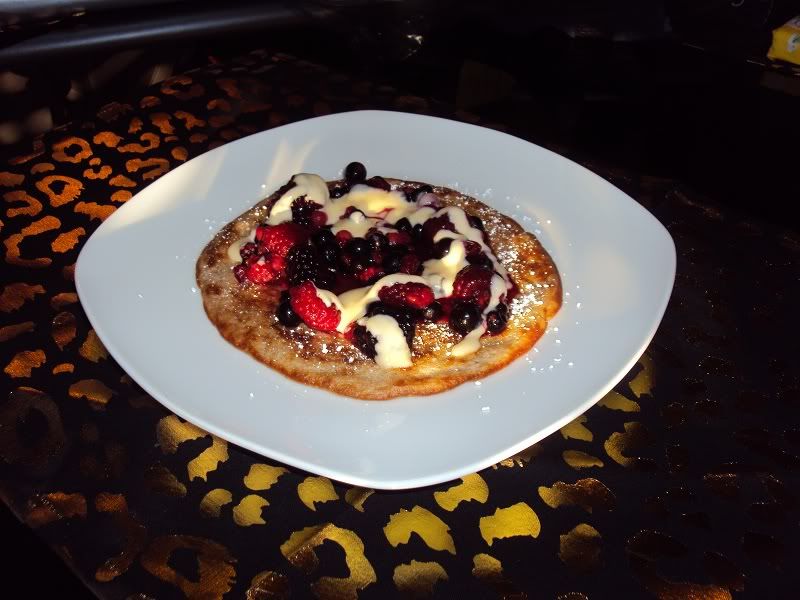 Zum garnieren haben wir uns für Beeren und Vanillesoße entschieden, zwischen dem Triple-Pancake war noch eine Schicht Apfelmus und als Topping wieder Beeren mit Vanille-Eis und Dessertsoße.
